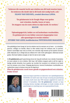 In De geluksroute geeft psycholoog Anne de Jong dé methode voor minder frustraties en meer plezier in al je relaties. Met haar vijf heldere stappen pak je zelf de regie in lastige sociale situaties, los je gedoe op voordat het escaleert en verbeter je je band met de mensen om je heen. Grappig geschreven, bomvol herkenbare voorbeelden en opdrachten waar je meteen mee aan de slag kunt.