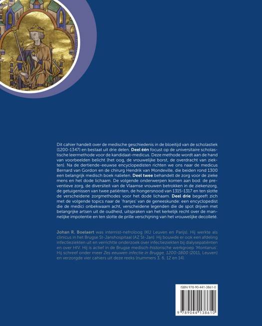 Dit cahier handelt over de medische geschiedenis in de bloeitijd van de scholastiek (1200-1347) en bestaat uit drie delen. <b>Deel één</b> focust op de universitaire scholastische leermethode voor de kandidaat-medicus. Deze methode wordt aan de hand van voorbeelden belicht (het oog, de vrouwelijke borst, de overdracht van ziekten). Na de dertiende-eeuwse encyclopedisten richten we ons naar de medicus Bernard van Gordon en de chirurg Hendrik van Mondeville, die beiden rond 1300 een belangrijk medisch boek nalieten. <b>Deel twee</b> behandelt de zorg voor de zieke mens en het dode lichaam. De volgende onderwerpen komen aan bod: de preventieve zorg, de diversiteit van de Vlaamse vrouwen betrokken in de ziekenzorg, de getuigenissen van twee patiënten, de hongersnood van 1315-1317 en ten slotte de verscheidene zorgmethodes voor het dode lichaam. <b>Deel drie</b> begeeft zich met de volgende topics naar de ‘franjes’ van de geneeskunde: een encyclopedist die de medici onbekwaam acht, verscheidene legenden die de spot drijven met belangrijke artsen uit de oudheid, uitspraken van het kerkelijk recht over de mannelijke impotentie en ten slotte de prille verschijning van het vrouwelijke decolleté.<br/><br/>