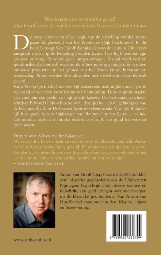 De twee eeuwen rond het begin van de jaartelling worden doorgaans als glorietijd van het Romeinse Rijk beschouwd. In dit boek betoogt Anton Van Hooff dat juist de tweede eeuw n.C. meer aanspraak maakt op de betiteling Gouden Eeuw. Het Rijk bereikte zijn grootste omvang. Er waren geen burgeroorlogen. Overal heerste een enorme bouwactiviteit, waarvan de ruïnes nu nog getuigen. Zeker in kwantiteit was er een immense productie van beeldende kunst, literatuur en wetenschap. Nooit werden de oude goden met zoveel tempels en festivals geëerd. Vanaf Nerva (96 n.C.) stierven vijf keizers in hun bed – pas in 192 werd er weer een vorst vermoord: Commodus. Deze despoot brak de reeks van vijf goede keizers af. In 'De Gouden Eeuw van Rome' maakt Van Hooff duidelijk hoe goede keizers bijdroegen aan Romes Gouden Eeuw – en hoe Commodus, zoals een antieke historicus schrijft, het goud tot verroest ijzer maakte.