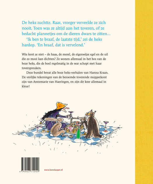 Ze is de meest geliefde tovenares van de lage landen: de boze heks van Hanna Kraan. Generaties kinderen groeiden op met de narrige heks en de dieren met wie ze in het bos samenleeft. Nu zijn alle verhalen voor het eerst gebundeld in één dik boek. Annemarie van Haeringen pakte haar penseel opnieuw op om alle verhalen te voorzien van illustraties in kleur. Het resultaat is een boek dat geen lezer mag missen – of je de verhalen nu al kent of nog niet!