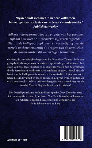 Met De Hellepoort komt Anthony Ryans epische Zeven Zwaarden-saga tot een magnifiek einde. Valkeris – De eeuwenoude zetel van het gevallen rijk dat ooit over de uitgestrekte vijf zeeën regeerde. Hier zal de Hellepoort opkomen en vernietiging over de wereld ontketenen, tenzij de dragers van de vervloekte demonzwaarden het kunnen stoppen. Guyime, de onsterfelijke drager van het Naamloze Zwaard, leidt zijn groep buitenbeentjes naar de duistere, spookachtige ruïnes onder het oude Valkeris. Daar moeten ze de dodelijke vallen overleven die de aartsdemon Kalthraxis voor hen heeft uitgezet terwijl hij zich haast om de Hellepoort te openen en monsterlijke legioenen los te laten. Liefde, loyaliteit en moed zullen op de proef worden gesteld en er zal een verschrikkelijke prijs worden geëist voor de redding van de wereld. Is Guyime bereid die te betalen? 'Ryan houdt zich niet in in deze volkomen bevredigende conclusie van De Zeven Zwaarden-serie.' Publisher's Weekly