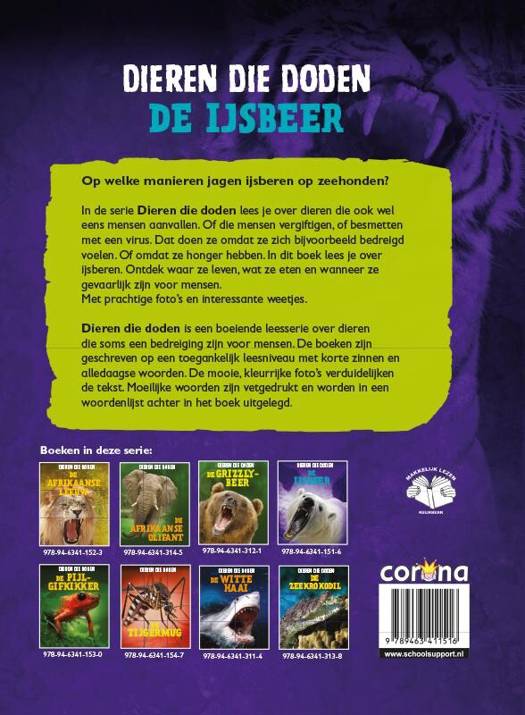 Op welke manieren jagen ijsberen op zeehonden? In de serieDieren die dodenlees je over dieren die ook wel eens mensen aanvallen. Of die mensen vergiftigen, of besmetten met een virus. Dat doen ze omdat ze zich bijvoorbeeld bedreigd voelen. Of omdat ze honger hebben. In dit boek lees je over ijsberen. Ontdek waar ze leven, wat ze eten en wanneer ze gevaarlijk zijn voor mensen. Met prachtige foto’s en interessante weetjes. Dieren die doden is een boeiende leesserie over dieren die soms een bedreiging zijn voor mensen. De boeken zijn geschreven op een toegankelijk leesniveau met korte zinnen en alledaagse woorden. De mooie, kleurrijke foto’s verduidelijken de tekst. Moeilijke woorden zijn vetgedrukt en worden in een woordenlijst achter in het boek uitgelegd.