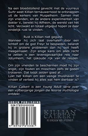 Na een bloedstollend gevecht met de vuurreus Surtr weet Killian ternauwernood te ontsnappen uit de kerkers van Muspelheim. Samen met zijn vrienden, en de andere experimenten van dokter V., bereikt hij Alfheim, de wereld van het licht. Verzwakt en totaal uitgeput hopen ze daar eindelijk rust te vinden. Rust is Killian niet gegund. Wanneer hij zich laat overhalen door een lichtelf om de god Freyr te bespieden, belandt hij in grotere problemen dan hij ooit heeft meegemaakt. Zijn enige kans om alles recht te zetten is een levensgevaarlijke reis naar Jotunheim, het ijskoude rijk van de reuzen. Om zijn vrienden te beschermen moet hij zijn angst, zijn fouten en misschien zelfs de goden trotseren. Dat loopt zelden goed af... Lukt het Killian om een veilige thuishaven te vinden, of verliest hij alles wat hem dierbaar is? Killian Calkert is een Young Adult serie over een vijftienjarige jongen die Noorse mythologie ontdekt.