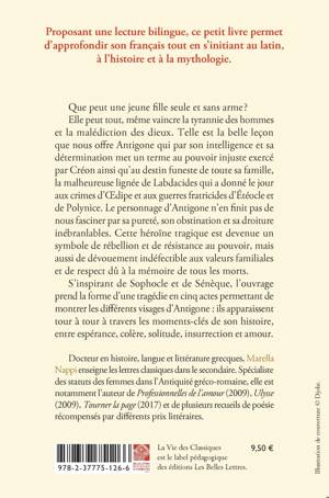 Elle peut tout, même vaincre la tyrannie des hommes et la malédiction des dieux. Telle est la belle leçon que nous offre Antigone qui par son intelligence et sa détermination met un terme au pouvoir injuste exercé par Créon ainsi qu’au destin funeste de toute sa famille, la malheureuse lignée de Labdacides qui a donné le jour aux crimes d’OEdipe et aux guerres fratricides d’Étéocle et de Polynice. Le personnage d’Antigone n’en finit pas de nous fasciner par sa pureté, son obstination et sa droiture inébranlables. Cette héroïne tragique est devenue un symbole de rébellion et de résistance au pouvoir, mais aussi de dévouement indéfectible aux valeurs familiales et de respect dû à la mémoire de tous les morts. S’inspirant de Sophocle et de Sénèque, l’ouvrage prend la forme d’une tragédie en cinq actes permettant de montrer les différents visages d’Antigone : ils apparaissent tour à tour à travers les moments-clés de son histoire, entre espérance, colère, solitude, insurrection et amour.