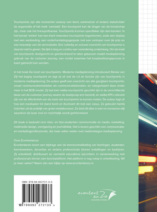 In het boek 'De inzet van touchpoints. Moderne mediaplanning' introduceert Renée van Zijl het begrip touchpoint en legt zij uit wat de rol en functie zijn van touchpoints in moderne mediaplanning. De auteur geeft een overzicht van alle gangbare touchpoints, zowel communicatiemiddelen als communicatiekanalen, en categoriseert deze onder meer in het BOE-model. Zij laat zien welke touchpoints geschikt zijn in de verschillende fases van de customer journey waarin de doelgroep zich bevindt, en welke KPI's relevant zijn om de effectiviteit van de inzet van touchpoints te kunnen meten. De auteur legt uit hoe een mediaplan tot stand komt en illustreert dit met een casus. Ze gebruikt hierbij inzichten uit de praktijk van grote mediabureaus. Ze doet dit alles in een no-nonsense-stijl waardoor de lezer snel en inzichtelijk wordt geïnformeerd.