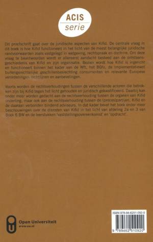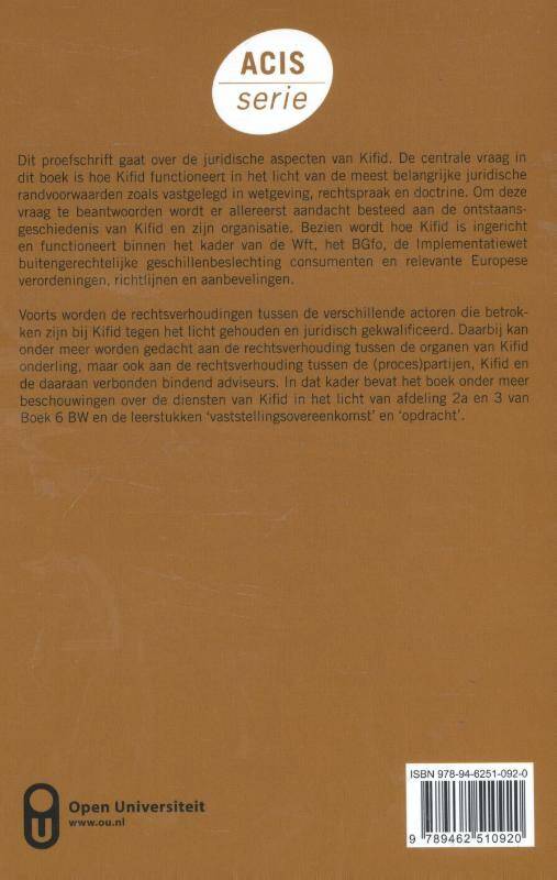 Dit proefschrift gaat over de juridische aspecten van Kifid. De centrale vraag in dit boek is hoe Kifid functioneert in het licht van de meest belangrijke juridische randvoorwaarden zoals vastgelegd in wetgeving, rechtspraak en doctrine. Om deze vraag te beantwoorden wordt er allereerst aandacht besteed aan de ontstaansgeschiedenis van Kifid en zijn organisatie. Bezien wordt hoe Kifid is ingericht en functioneert binnen het kader van de Wft, het BGfo, de Implementatiewet buitengerechtelijke geschillenbeslechting consumenten en relevante Europese verordeningen, richtlijnen en aanbevelingen. Voorts worden de rechtsverhoudingen tussen de verschillende actoren die betrokken zijn bij Kifid tegen het licht gehouden en juridisch gekwalificeerd. Daarbij kan onder meer worden gedacht aan de rechtsverhouding tussen de organen van Kifid onderling, maar ook aan de rechtsverhouding tussen de (proces)partijen, Kifid en de daaraan verbonden bindend adviseurs. In dat kader bevat het boek onder meer beschouwingen over de diensten van Kifid in het licht van afdeling 2a en 3 van Boek 6 BW en de leerstukken 'vaststellingsovereenkomst' en 'opdracht'.