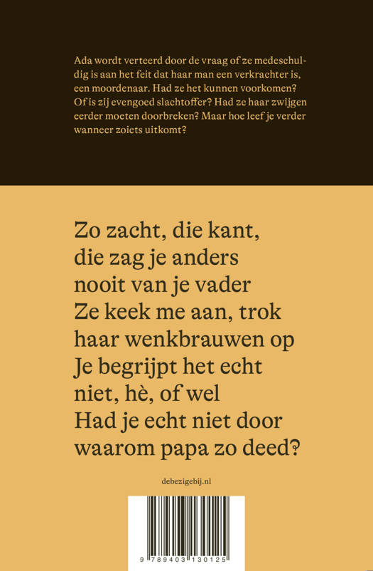 of ze medeschuldig is aan het feit dat haar man een verkrachter is, een moordenaar. Had ze het kunnen voorkomen? ‘Als ik hem gegeven had wat hij wilde, als ik hem had gegeven wat hij nodig had…’ Of is zij evengoed slachtoffer? Had ze haar zwijgen eerder moeten doorbreken? Maar hoe leef je verder wanneer zoiets uitkomt? Via confronterende vragen vertelt Ada nu voorzichtig haar verhaal, van de arrestatie van haar man Tille tot de dag van vandaag – want Tille komt binnenkort vrij…