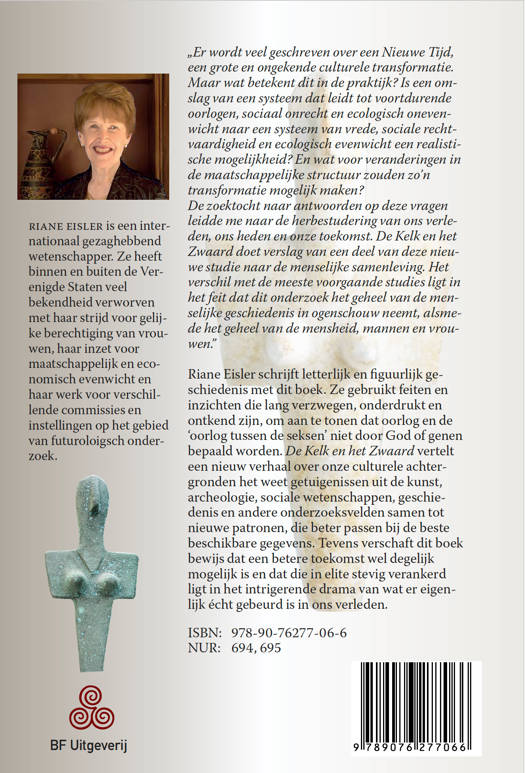 Riane Eisler schrijft letterlijk en figuurlijk geschiedenis met dit boek. Ze gebruikt feiten en inzichten die lang verzwegen, onderdrukt en ontkend zijn, om aan te tonen dat oorlog en de 'oorlog tussen de seksen' niet door God of genen bepaald worden. De Kelk en het Zwaard vertelt een nieuw verhaal over onze culturele achtergronden het weet getuigenissen uit de kunst, archeologie, sociale wetenschappen, geschiedenis en andere onderzoeksvelden samen tot nieuwe patronen, die beter passen bij de beste beschikbare gegevens. Tevens verschaft dit boek bewijs dat een betere toekomst wel degelijk mogelijk is en dat die in elite stevig verankerd ligt in het intrigerende drama van wat er eigenlijk écht gebeurd is in ons verleden.