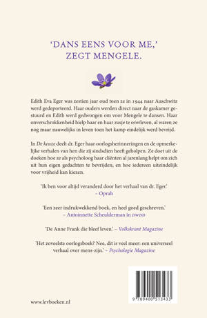 Edith Eva Eger was zestien jaar oud toen ze in 1944 naar Auschwitz werd gedeporteerd. Haar ouders werden direct naar de gaskamer gestuurd en Edith werd gedwongen om voor Mengele te dansen. Haar onverschrokkenheid hielp haar en haar zusje te overleven, al waren ze nog maar nauwelijks in leven toen het kamp eindelijk werd bevrijd.