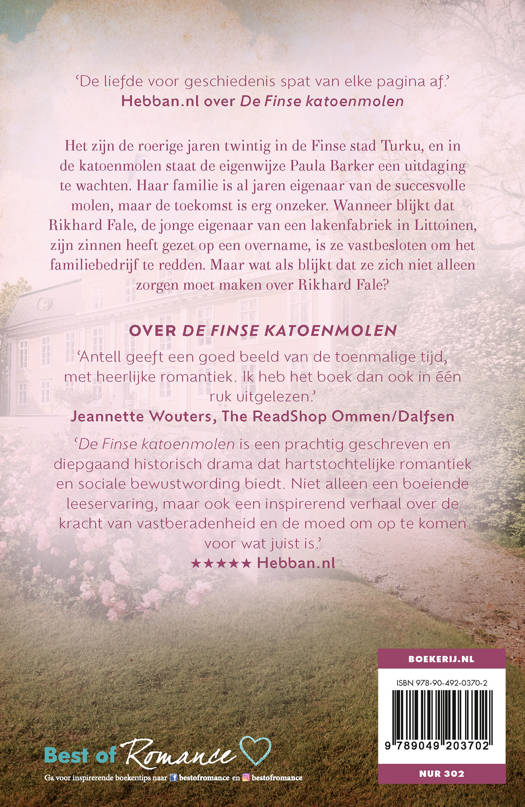 ‘De Finse katoenmolen is een prachtig geschreven en diepgaand historisch drama dat hartstochtelijke romantiek en sociale bewustwording biedt. Niet alleen een boeiende leeservaring, maar ook een inspirerend verhaal over de kracht van vastberadenheid en de moed om op te komen voor wat juist is.’ ***** Hebban.nl