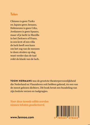 TOON HERMANS was de grootste theaterpersoonlijkheid die Nederland en Vlaanderen ooit hebben gekend, én een van de meest gelezen dichters. Dit boek bevat een bundeling van zijn leukste verzen en taalgrapjes.