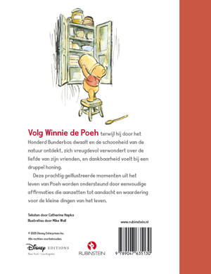 Volg Winnie de Poeh terwijl hij door het Honderd Bunderbos dwaalt en de schoonheid van de natuur ontdekt, zich vreugdevol verwondert over de liefde van zijn vrienden, en dankbaarheid voelt bij een druppel honing. Deze prachtig geïllustreerde momenten uit het leven van Poeh worden ondersteund door eenvoudige affirmaties die aanzetten tot aandacht en waardering voor de kleine dingen van het leven.