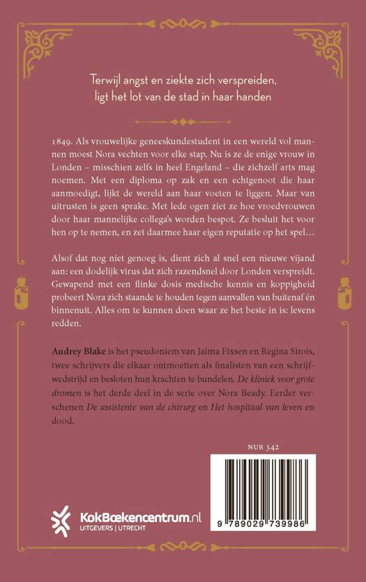 ‘De kliniek voor grote dromen’ van Audrey Blake is het derde deel in de historische serie over de eigenzinnige Nora Beady, die steeds verder weet op te klimmen in de door mannen gedomineerde medische wereld. Inmiddels is ze zelfs uitgegroeid tot de enige vrouwelijke arts van heel Engeland. Maar tijd om op haar lauweren te rusten heeft ze niet, want een dodelijk virus verspreidt zich razendsnel door Londen. Bovendien ligt ze zelf onder vuur vanwege haar pleidooi voor een volwaardige rol voor vroedvrouwen.
