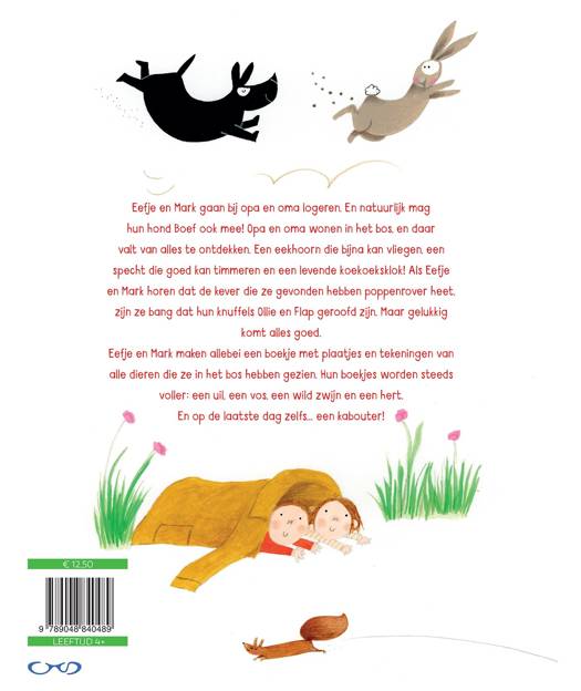 Eefje en Mark gaan bij opa en oma logeren. En natuurlijk mag hun hond Boef ook mee! Opa en oma wonen in het bos, en daar valt van alles te ontdekken. Een eekhoorn die bijna kan vliegen, een specht die goed kan timmeren en een levende koekoeksklok! Als Eefje en Mark horen dat de kever die ze gevonden hebben poppenrover heet, zijn ze bang dat hun knuffels Ollie en Flap geroofd zijn. Maar gelukkig valt het mee! Mark en Eefje maken allebei een boekje met plaatjes en tekeningen van alle dieren die ze in het bos hebben gezien. Hun boekjes worden steeds voller: een uil, een vos, een wild zwijn, een hert... En op de laatste dag zelfs... een kabouter!