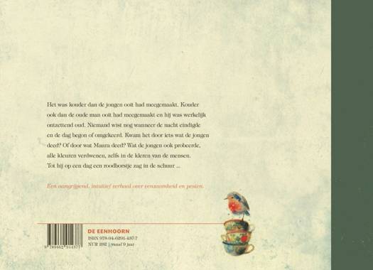 Een bijzonder verhaal boordevol symboliek en verbeeldingskracht. Met schitterende, gedetailleerde illustraties van Alain Verster. Vanaf 9 jaar. Aangrijpend, intuïtief verhaal over eenzaam zijn en pesten. Het was kouder dan de jongen ooit had meegemaakt. Kouder ook dan de oude man ooit had meegemaakt en hij was werkelijk ontzettend oud. Niemand wist nog wanneer de nacht eindigde en de dag begon of omgekeerd. Kwam het door iets wat de jongen deed? Of door wat Maura deed? Wat de jongen ook probeerde, alle kleuren verdwenen, zelfs in de kleren van de mensen. Tot hij op een dag een roodborstje zag in de schuur ...