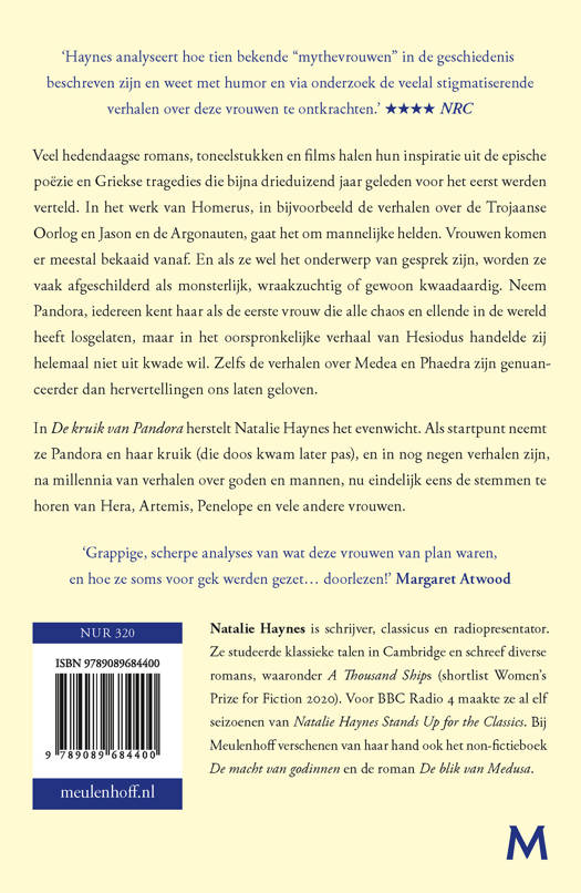 In De kruik van Pandora herstelt Natalie Haynes het evenwicht. Als startpunt neemt ze Pandora en haar kruik (die doos kwam later pas), en in nog negen verhalen zijn, na millennia van verhalen over goden en mannen, nu eindelijk eens de stemmen te horen van Hera, Artemis, Penelope en vele andere vrouwen.