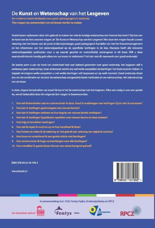 Met deze tien vragen houdt u zowel rekening met het kiezen van de juiste onderwijsstrategie, goed pedagogisch handelen als met het klassenmanagement en het afstemmen van het onderwijsaanbod op de specifieke leerlingen in de klas. Marzano heeft alle relevante wetenschappelijke publicaties voor u op waarde geschat en overzichtelijk samengevat in dit boek. Wilt u deze waardevolle kennis handig gebruiken om uw lessen te verbeteren? Het kan met dit raamwerk voor goed onderwijs!