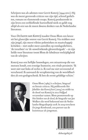 Voor De kuren van Komrij maakte Onno Blom een keuze uit het glansrijke oeuvre van Gerrit Komrij. Via stukken over zijn jeugd, zijn meest vileine polemieken en maatschappijkritieken – met onder meer aanvallen op zondagsdichters, ‘de treurbuis’ en ‘de onwelriekende gleuvenbrigade’ – en zijn liefde voor literatuur toont Blom de fabuleuze veelzijdigheid van de schrijver.