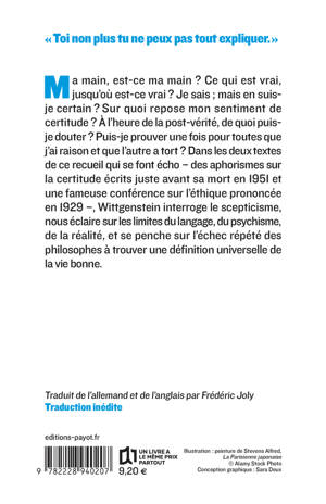 Ma main, est-ce ma main ? Ce qui est vrai, jusqu'où est-ce vrai ? Je sais ; mais en suis-je certain ? Sur quoi repose mon sentiment de certitude ? À l'heure de la post-vérité, de quoi puis-je douter ? Puis-je prouver une fois pour toutes que j'ai raison et que l'autre a tort ? Dans les deux textes de ce recueil qui se font écho - des aphorismes sur la certitude écrits juste avant sa mort en 1951 et une fameuse conférence sur l'éthique prononcée en 1929 -, Wittgenstein interroge le scepticisme, nous éclaire sur les limites du langage, du psychisme, de la réalité, et se penche sur l'échec répété des philosophes à trouver une définition universelle de la vie bonne.