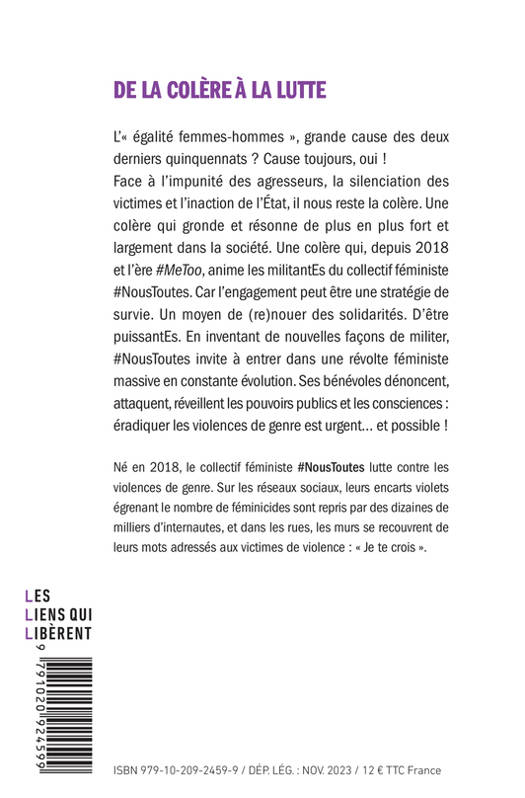 L' « égalité femmes-hommes », grande cause des deux derniers quinquennats ? Cause toujours, oui ! Face à l'impunité des agresseurs, la silenciation des victimes et l'inaction de l'État, il nous reste la colère. Une colère qui gronde et résonne de plus en plus fort et largement dans la société. Une colère qui, depuis 2018 et l'ère #MeToo, anime les militantEs du collectif féministe #NousToutes. Car l'engagement peut être une stratégie de survie. Un moyen de (re)nouer des solidarités. D'être puissantEs. En inventant de nouvelles façons de militer, #NousToutes invite à entrer dans une révolte féministe massive en constante évolution. Ses bénévoles dénoncent, attaquent, réveillent les pouvoirs publics et les consciences : éradiquer les violences de genre est urgent... et possible !