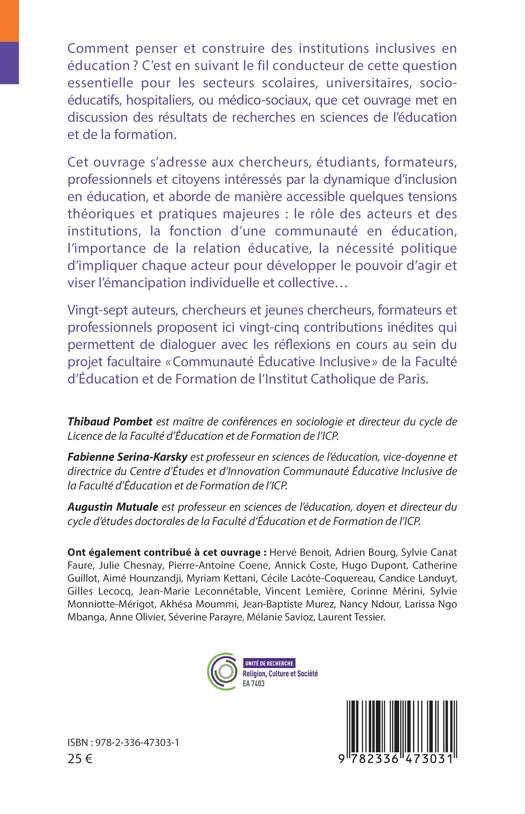 Comment penser et construire des institutions inclusives en éducation ? C'est en suivant le fil conducteur de cette question essentielle pour les secteurs scolaires, universitaires, hospitaliers, ou médico-sociaux, que cet ouvrage met en discussion des résultats de recherches en sciences de l'éducation et de la formation. Cet ouvrage s'adresse aux chercheurs, étudiants, formateurs, professionnels et citoyens intéressés par la dynamique d'inclusion en éducation, et aborde de manière accessible quelques tensions théoriques et pratiques majeures: le rôle des acteurs et des institutions, la fonction d'une communauté en éducation, l'importance de la relation éducative, la nécessité politique d'impliquer chaque acteur pour développer le pouvoir d'agir et viser l'émancipation individuelle et collective... Vingt-sept auteurs, chercheurs et jeunes chercheurs, formateurs et professionnels proposent ici vingt-cinq contributions inédites qui permettent de dialoguer avec les réflexions en cours au sein du projet facultaire Communauté Éducative Inclusive de la Faculté d'Éducation et de Formation de l'Institut Catholique de Paris.