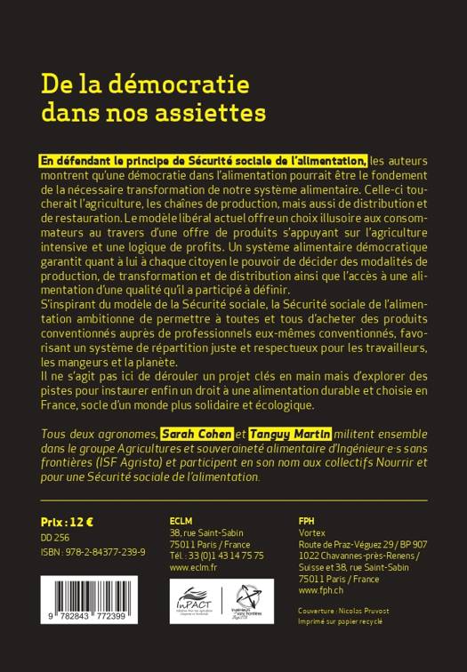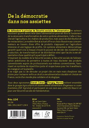 En défendant le principe de Sécurité sociale de l’alimentation, les auteurs montrent qu’une démocratie dans l’alimentation pourrait être le fondement de la nécessaire transformation de notre système alimentaire. Celle-ci toucherait l’agriculture, les chaînes de production, mais aussi de distribution et de restauration. Le modèle libéral actuel offre un choix illusoire aux consommateurs au travers d’une offre de produits s’appuyant sur l’agriculture intensive et une logique de profits. Un système alimentaire démocratique garantit quant à lui à chaque citoyen le pouvoir de décider des modalités de production, de transformation et de distribution ainsi que l’accès à une alimentation d’une qualité qu’il a participé à définir. S’inspirant du modèle de la Sécurité sociale, la Sécurité sociale de l’alimentation ambitionne de permettre à toutes et tous d’acheter des produits conventionnés auprès de professionnels eux-mêmes conventionnés, favorisant un système de répartition juste et respectueux pour les travailleurs, les mangeurs et la planète. Il ne s’agit pas ici de dérouler un projet clés en main mais d’explorer des pistes pour instaurer enfin un droit à une alimentation durable et choisie en France, socle d’un monde plus solidaire et écologique. Tous deux agronomes, Sarah Cohen et Tanguy Martin militent ensemble dans le groupe Agricultures et souveraineté alimentaire d’Ingénieur·e·s sans frontières (ISF Agrista) et participent en son nom aux collectifs Nourrir et pour une Sécurité sociale de l’alimentation.