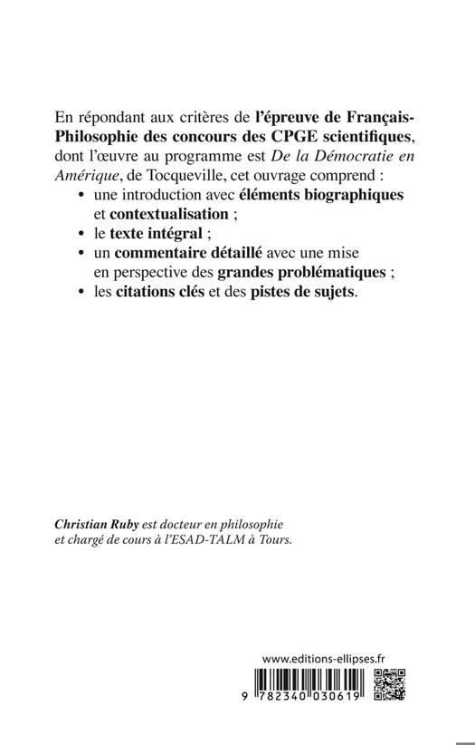 En répondant aux critères de l’épreuve de Français-Philosophie des concours des CPGE scientifiques, dont l’oeuvre au programme est De la Démocratie en Amérique, de Tocqueville, cet ouvrage comprend :
