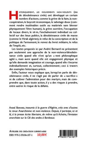Les textes proposés ici par André Bernard ne présentent pas seulement une approche de la non-violence/désobéissance civile quand elle n’est qu’un « vent philosophique agité », mais aussi quand elle est engagement physique et qu’elle demande imagination et courage, quand elle s’incarne individuellement et, surtout, collectivement ; ceci à travers des exemples historiques précis.