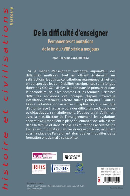 Si le métier d’enseignant rencontre aujourd’hui des difficultés multiples, tout en offrant également ses satisfactions, les quinze contributions regroupées ici mettent en perspective les vulnérabilités enseignantes sur la longue durée des XIXe-XXIe siècles, à la fois dans le primaire et dans le secondaire, pour les hommes et les femmes. Certaines difficultés anciennes ont presque disparu (mauvaise installation matérielle, étroite tutelle politique). D’autres, liées à de faibles connaissances disciplinaires, à un manque d’autorité face à la classe ou à des difficultés pédagogiques et didactiques, se maintiennent. D’autres enfin s’affirment avec la massification de l’enseignement et les évolutions sociétales qui modifient la place de l’enfant et de l’adolescent dans la famille et dans l’École. Les mutations accélérées de l’accès aux informations, via les nouveaux médias, modifient aussi la place de l’enseignant alors que les modalités de sa formation ont du mal à se stabiliser.