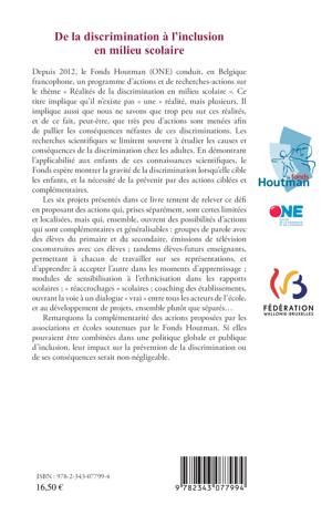 Comment pallier les conséquences néfastes de la discrimination en milieu scolaire ? Les six projets présentés ici ouvrent des possibilités d'action complémentaires et généralisables : groupes de parole avec des élèves, émissions de TV construites avec des élèves, tandem élèves-futurs enseignants, modules de sensibilisation à l'ethnicisation dans les rapports scolaires, réaccrochages scolaires, coaching des établissements ouvrant la voie à un dialogue "vrai" entre tous les acteurs de l'école et au développement de projets ensemble plutôt que séparés.