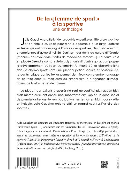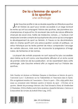 Julie Gaucher profite ici de sa double expertise en littérature sportive et en histoire du sport pour rendre accessible à un large lectorat les textes qui ont accompagné l'histoire des sportives, des pionnières aux championnes d'aujourd'hui. Cette anthologie a pour objectif de permettre une meilleure compréhension historique de certains discours, tout en mettant en valeur la prégnance d'imaginaires et de normes. En réunissant une centaine de textes de nature différente : manuels de savoir-vivre, traités de médecine, romans... l'auteure s'est employée à rendre compte de la polyphonie discursive qui accompagne le développement du sport au féminin. Certains des textes présentés ne sont plus accessibles aujourd'hui alors même qu'ils ont connu une importante diffusion et un écho social de premier ordre lors de leur publication. Chacun des extraits est accompagné d'une notice introductive. L'approche chronologique, par auteurs et par sports, permet au lecteur de choisir son parcours de lecture