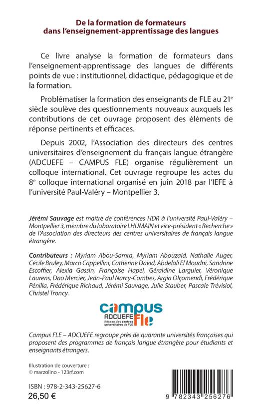 Ce livre analyse la formation de formateurs dans l’enseignement-apprentissage des langues de différents points de vue : institutionnel, didactique, pédagogique et de la formation. Problématiser la formation des enseignants de FLE au 21e siècle soulève des questionnements nouveaux auxquels les contributions de cet ouvrage proposent des éléments de réponse pertinents et efficaces. Depuis 2002, l’Association des directeurs des centres universitaires d’enseignement du français langue étrangère (ADCUEFE - CAMPUS FLE) organise régulièrement un colloque international. Cet ouvrage regroupe les actes du 8e colloque international organisé en juin 2018 par l’IEFE à l’université Paul-Valéry - Montpellier 3.