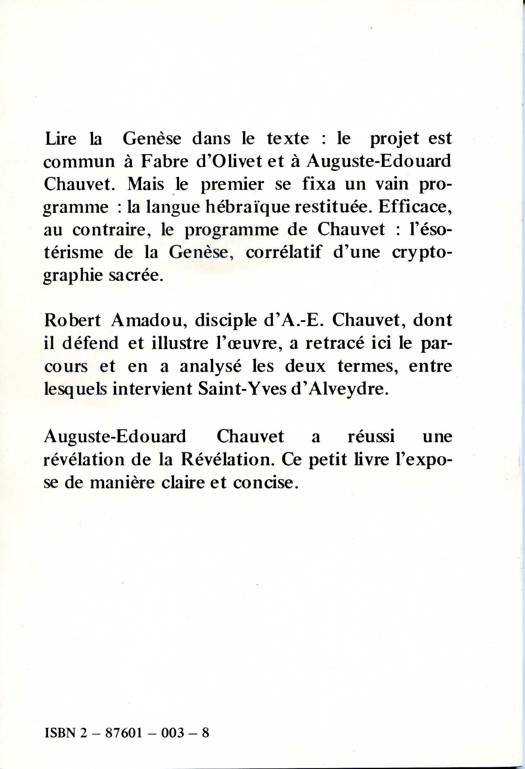 Antoine Fabre-d’Olivet, dans son ouvrage « La langue hébraïque restituée », paru en 1815, tente de connaître l’homme et le monde, à partir des origines sous le chiffre de la Genèse, c’est-à-dire dans les lettres hébraïques qui composent le premier livre de la Bible. Auguste-Edouard Chauvet, au milieu du XXe siècle, dans sa pentalogie « Ésotérisme de la genèse », rend hommage à d’Olivet, puis allègue nombre de ses réussites et de ses erreurs « linguistico-doctrinales ». Robert Amadou, disciple de Chauvet retrace ici le parcours de cet auteur, en comparant son étude à celle d’Olivet, en passant par Saint-Yves d’Alveydre.