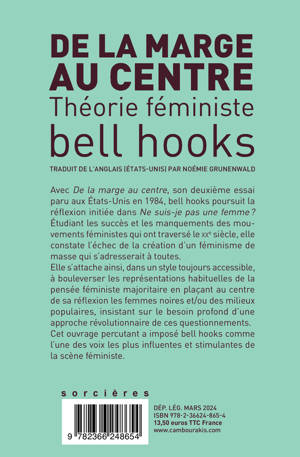 Avec De la marge au centre, son deuxième essai paru aux États-Unis en 1984, bell hooks poursuit la réflexion initiée dans Ne suis- je pas une femme ? Étudiant les succès et les manquements des mouvements féministes qui ont traversé le xxe siècle, elle constate l'échec de la création d'un féminisme de masse qui s'adresserait à toutes. Elle s'attache ainsi, dans un style toujours accessible, à bouleverser les représentations habituelles de la pensée féministe majoritaire en plaçant au centre de sa réflexion les femmes noires et/ou des milieux populaires, insistant sur le besoin profond d'une approche révolutionnaire de ces questionnements. Cet ouvrage percutant a imposé bell hooks comme l'une des voix les plus influentes et stimulantes de la scène féministe.