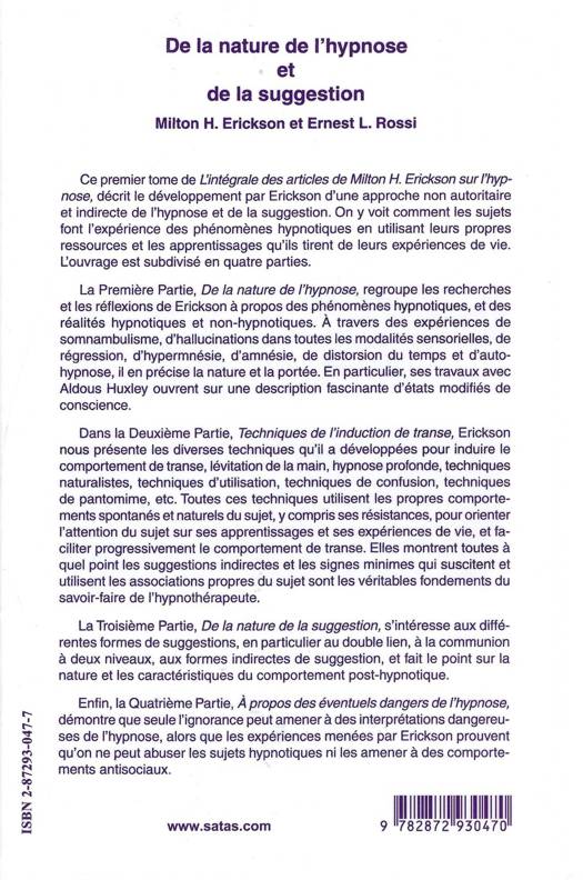 Ce premier tome de l'intégralité des articles de Milton Erickson sur l'hypnose, décrit le développement par Erickson d'une approche non autoritaire et indirecte de l'hypnose et de la suggestion. On y voit comment les sujets font l'expérience des phénomènes hypnotiques en utilisant leurs propres ressources et les apprentissages qu'ils tirent de leurs expériences de vie. L'ouvrage est subdivisé en quatre parties. La Première Partie, De la nature de l'hypnose, regroupe les recherches et les réflexions de Erickson à propos des phénomènes hypnotiques, et des réalités hypnotiques et non-hypnotiques. À travers des expériences de somnambulisme, d'hallucinations dans toutes les modalités sensorielles, de régression, d'hypermnésie, d'amnésie, de distorsion du temps et d'autohypnose, il en précise la nature et la portée. En particulier, ses travaux avec Aldous Huxley ouvrent sur une description fascinante d'états modifiés de conscience. Dans la Deuxième Partie, Techniques de l'induction de transe, Erickson nous présente les diverses techniques qu'il a développées pour induire le comportement de transe, lévitation de la main, hypnose profonde, techniques naturalistes, techniques d'utilisation, techniques de confusion, techniques de pantomime, etc. Toutes ces techniques utilisent les propres comportements spontanés et naturels du sujet, y compris ses résistances, pour orienter l'attention du sujet sur ses apprentissages et ses expériences de vie, et faciliter progressivement le comportement de transe. Elles montrent toutes à quel point les suggestions indirectes et les signes minimes qui suscitent et utilisent les associations propres du sujet sont les véritables fondements du savoir-faire de l'hypnothérapeute. La Troisième Partie, De la nature de la suggestion, s'intéresse aux différentes formes de suggestions, en particulier au double lien, à la communion à deux niveaux, aux formes indirectes de suggestion, et fait le point sur la nature et les caractéristiques du comportement post-hypnotique. Enfin, la Quatrième Partie, À propos des éventuels dangers de l'hypnose, démontre que seule l'ignorance peut amener à des interprétations dangereuses de l'hypnose, alors que les expériences menées par Erickson prouvent qu'on ne peut abuser les sujets hypnotiques ni les amener à des comportements antisociaux.