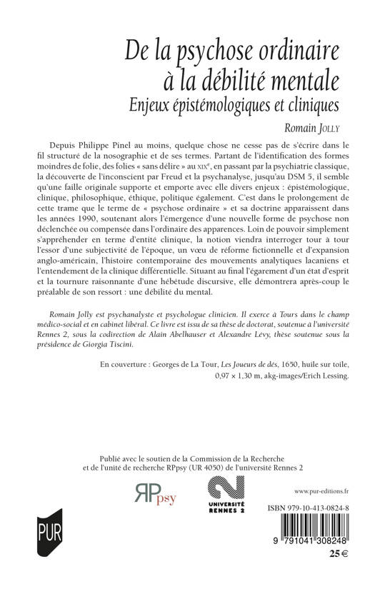 Depuis Philippe Pinel au moins, quelque chose ne cesse pas de s’écrire dans le fil structuré de la nosographie et de ses termes. Partant de l’identification des formes moindres de folie, des folies « sans délire » au XIXe, en passant par la psychiatrie classique, la découverte de l’inconscient par Freud et la psychanalyse, jusqu’au DSM 5, il semble qu’une faille originale supporte et emporte avec elle divers enjeux : épistémologique, clinique, philosophique, éthique, politique également. C’est dans le prolongement de cette trame que le terme de « psychose ordinaire » et sa doctrine apparaissent dans les années 1990, soutenant alors l’émergence d’une nouvelle forme de psychose non déclenchée ou compensée dans l’ordinaire des apparences. Loin de pouvoir simplement s’appréhender en terme d’entité clinique, la notion viendra interroger tour à tour l’essor d’une subjectivité de l’époque, un voeu de réforme fictionnelle et d’expansion anglo-américain, l’histoire contemporaine des mouvements analytiques lacaniens et l’entendement de la clinique différentielle. Situant au final l’égarement d’un état d’esprit et la tournure raisonnante d’une hébétude discursive, elle démontrera après-coup le préalable de son ressort : une débilité du mental.