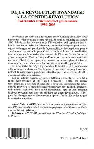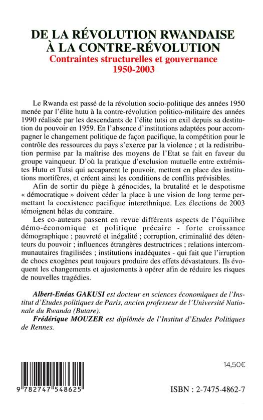 Afin de sortir du piège à génocides, la brutalité et le despotisme ""démocratique"" doivent céder la place à une vision de long terme permettant la coexistence pacifique interethnique. Les élections de 2003 témoignent hélas du contraire. Les auteurs passent en revue différents aspects de l'équilibre démo-économique et politique précaire qui fait que l'irruption de chocs exogènes peut toujours produire des effets dévastateurs. Ils évoquent les changements et ajustements à opérer afin de réduire les risques de nouvelles tragédies.