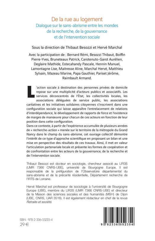 L'action sociale à destination des personnes privées de domicile repose sur une multiplicité d'acteurs publics et associatifs. Les services déconcentrés de l'État, les collectivités locales, les associations déléguées de service public, les associations caritatives et les initiatives solidaires citoyennes s'inscrivent dans une configuration sociale qui laisse apparaître l'entrelacement de relations d'interdépendance, le développement de rapports de force et l'existence de marges de manoeuvre pour chacun de ces acteurs en fonction de leur position dans cette configuration. Dans ce contexte, à partir de l'expérience accumulée de plusieurs années de recherche-action menée sur le territoire de la métropole du Grand Nancy dans le champ du sans-abrisme, cet ouvrage collectif démontre l'intérêt de ce type d'approche scientifique en proposant un bilan et une mise en perspective des résultats de ces travaux. Ainsi, il met en valeur l'articulation partenariale locale et présente les formes de coopération et de confrontation entre les acteurs de la gouvernance, de la recherche et de l'intervention sociale.