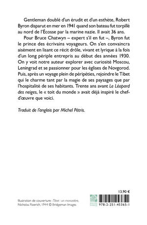 Pour Bruce Chatwyn – expert s’il en fut –, Byron fut le prince des écrivains voyageurs. On s’en convaincra aisément en lisant ce récit drôle, vivant et lyrique à la fois d’un long périple entrepris au début des années 1930. On y voit notre auteur explorer avec curiosité Moscou, Leningrad et se passionner pour les églises de Novgorod. Puis, après un voyage plein de péripéties, rejoindre le Tibet qui le charme tant par la magie de ses paysages que par l’hospitalité de ses habitants. Trente ans avant Le Léopard des neiges, le « toit du monde » avait déjà inspiré le chef d’œuvre que voici.
