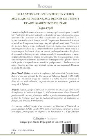 Plaisirs et bonheur sont souvent synonymes au XVIIe siècle et font l'objet d'un débat philosophique approfondi. Les études de ce volume portent sur les plaisirs des sens, tout particulièrement dans les arts: peinture, gravure, musique, danse, faisant place également aux appétits de Pierre l'Arétin et aux nuances de Pierre Bayle sur le caractère spirituel de tous nos plaisirs. Il accompagne un autre volume paru sous le titre : Approches critiques du plaisir.