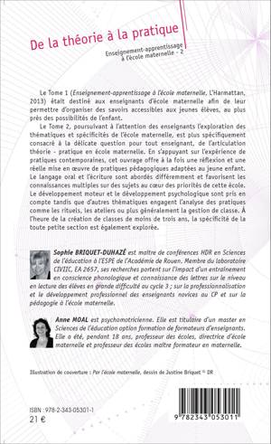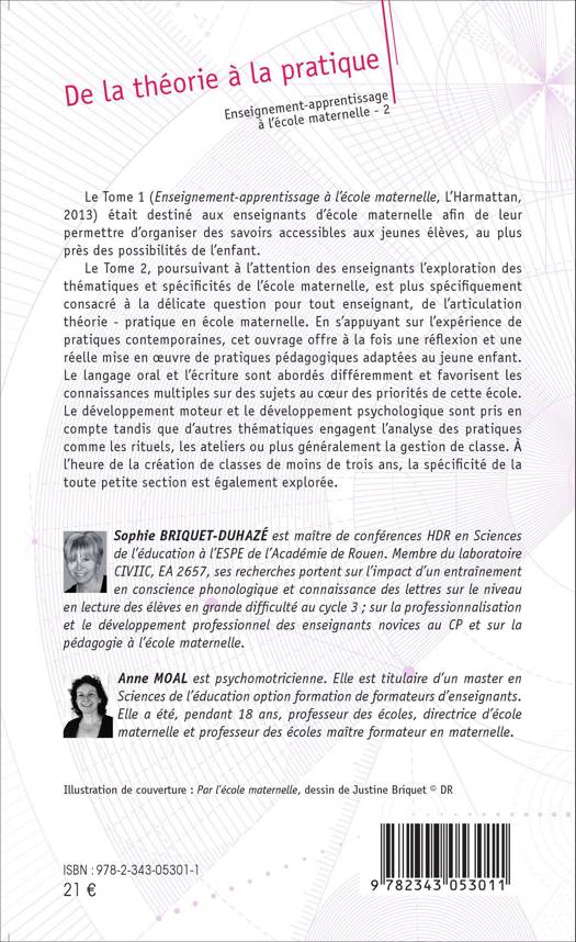 Faisant suite à Enseignement-apprentissage à l'école maternelle, cette réflexion est consacrée plus spécifiquement à la délicate question pour tout enseignant de l'articulation théorie-pratique en école maternelle. Le langage oral et l'écriture sont abordés ainsi que le développement moteur et psychologique. A l'heure de la création de classes de moins de trois ans, la spécificité de la toute petite section est explorée.
