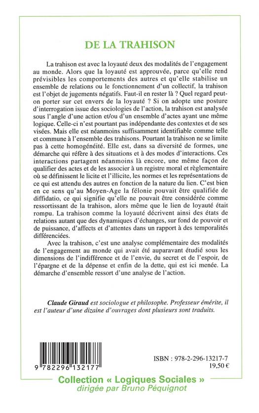 La trahison est avec la loyauté deux des modalités de l'engagement au monde. Alors que la loyauté est approuvée, la trahison est l'objet de jugements négatifs. Faut-il en rester là ? Quel regard peut-on porter sur cet envers de la loyauté ? La trahison comme la loyauté décrivent des états de relations autant que des dynamiques d'échanges, sur fond de pouvoir, de puissance, d'affects et d'attentes.