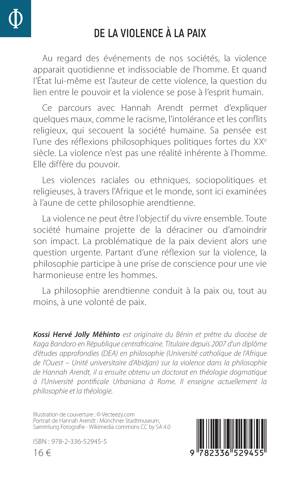 Au regard des événements de nos sociétés, la violence apparait quotidienne et indissociable de l'homme. Et quand l'État lui-même est l'auteur de cette violence, la question du lien entre le pouvoir et la violence se pose à l'esprit humain. Ce parcours avec Hannah Arendt permet d'expliquer quelques maux, comme le racisme, l'intolérance et les conflits religieux, qui secouent la société humaine. Sa pensée est l'une des réflexions philosophiques politiques fortes du XXe siècle. La violence n'est pas une réalité inhérente à l'homme. Elle diffère du pouvoir. Les violences raciales ou ethniques, sociopolitiques et religieuses, à travers l'Afrique et le monde, sont ici examinées à l'aune de cette philosophie arendtienne. La violence ne peut être l'objectif du vivre ensemble. Toute société humaine projette de la déraciner ou d'amoindrir son impact. La problématique de la paix devient alors une question urgente. Partant d'une réflexion sur la violence, la philosophie participe à une prise de conscience pour une vie harmonieuse entre les hommes. La philosophie arendtienne conduit à la paix ou, tout au moins, à une volonté de paix.