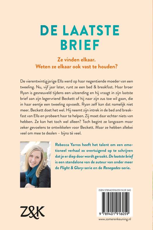 Rebecca Yarros is terug met ‘De laatste brief’, een aangrijpende feelgoodroman over een kick-ass single mom. Ella werd op haar negentiende moeder van een tweeling en runt nu, vijf jaar later, een bed & breakfast. Ze heeft per brief contact met Beckett, die met haar overleden broer in het leger zat. Dan komt Beckett zonder dat ze het weet terug van uitzending en gaat hij in haar B&B logeren om haar te helpen. Zij moet daar niets van hebben, ze kan het toch wel alleen? Maar haar kinderen zijn gek op hem. In ‘De laatste brief’ laat Rebecca Yarros zien dat hoe sterk je ook bent, de liefde vaak nóg sterker is.