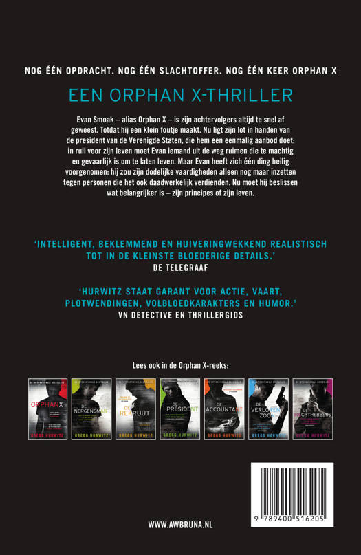 Evan Smoak – alias Orphan X – is zijn achtervolgers altijd te snel af geweest. Totdat hij een klein foutje maakt. Nu ligt zijn lot in handen van de president van de Verenigde Staten, die hem een eenmalig aanbod doet: in ruil voor zijn leven moet Evan iemand uit de weg ruimen die te machtig en gevaarlijk is om te laten leven. Maar Evan heeft zich één ding heilig voorgenomen: hij zou zijn dodelijke vaardigheden alleen nog maar inzetten tegen personen die het ook daadwerkelijk verdienden. Nu moet hij beslissen wat belangrijker is – zijn principes of zijn leven.