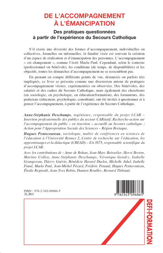 Ce livre se présente comme une discussion autour de pratiques d’accompagnement vécues, expérimentées ou observées. Des bénévoles, des salariés et des cadres du Secours Catholique, mais également des chercheurs (en sociologie, en psychologie, en éducation/formation), des formateurs, des praticiens (éducateur, psychologue, consultant), ont été invités à questionner et à penser l’accompagnement, à partir de l’expérience du Secours Catholique.