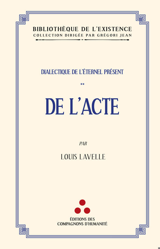 En 1937, Louis Lavelle, philosophe et professeur au Collège de France, fait paraître l’un de ses plus beaux ouvrages, De L’acte . Ce riche essai philosophique, resté de nombreuses années dans l’ombre, renaît ainsi. Louis Lavelle nous y invite, tout au long d’une réflexion aussi méthodique qu’inspirante à interroger, avec précision et finesse, le sens de notre participation au monde, la nature de notre immersion dans l’existence, une participation qui se réalise précisément dans l’Acte, notre Acte de participation :
