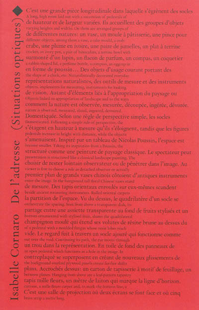 L'ouvrage associe des oeuvres de l'artiste (images de collections d'objets, projections colorées) à des dessins d'enfants, et à une adresse au lecteur en couverture. Ces éléments combinés prolongent le travail de déconstruction d'I. Cornaro ainsi que sa réflexion sur le paysage et sa représentation.