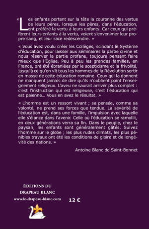 Les enfants portent sur la tête la couronne des vertus de leurs pères, lorsque les pères, dans l'éducation, ont préféré la vertu à leurs enfants. Car ceux qui préfèrent leurs enfants à la vertu, voient s'envenimer leur propre sang, et leur race redescendre. L'homme est un ressort vivant , sa pensée, comme sa volonté, ne prend ses forces que tendue. La sévérité de l'éducation est, dans une famille, l'impulsion avec laquelle elle s'élance dans l'avenir. Celle où l'éducation se ramollit, en deux générations verra sa fin. Dans le peuple, chez le paysan, les enfants sont généralement gâtés. Suivez l'homme sur le globe, les plus rudes climats, les plus pénibles travaux ont été les conditions de gloire et de longévité des nations. Or, la raison se développe, avant tout, par la Religion , ensuite par la métaphysique, les belles actions, les axiomes, la haute histoire, les sciences morales en général, enfin par tout ce qui cultive ses trois éléments impersonnels, qui sont le bien.