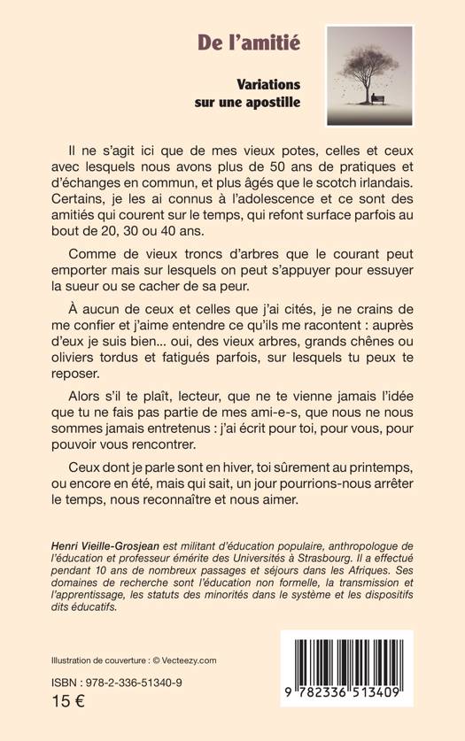 Il ne s'agit ici que de mes vieux potes, celles et ceux avec lesquels nous avons plus de 50 ans de pratiques et d'échanges en commun, et plus âgés que le scotch irlandais. Certains, je les ai connus à l'adolescence et ce sont des amitiés qui courent sur le temps, qui refont surface parfois au bout de 20, 30 ou 40 ans. Comme de vieux troncs d'arbres que le courant peut emporter mais sur lesquels on peut s'appuyer pour essuyer la sueur ou se cacher de sa peur. À aucun de ceux et celles que j'ai cités, je ne crains de me confier et j'aime entendre ce qu'ils me racontent: auprès d'eux je suis bien... oui, des vieux arbres, grands chênes ou oliviers tordus et fatigués parfois, sur lesquels tu peux te reposer. Alors s'il te plaît, lecteur, que ne te vienne jamais l'idée que tu ne fais pas partie de mes ami-e-s, que nous ne nous sommes jamais entretenus: j'ai écrit pour toi, pour vous, pour pouvoir vous rencontrer. Ceux dont je parle sont en hiver, toi sûrement au printemps, ou encore en été, mais qui sait, un jour pourrions-nous arrêter le temps, nous reconnaître et nous aimer.